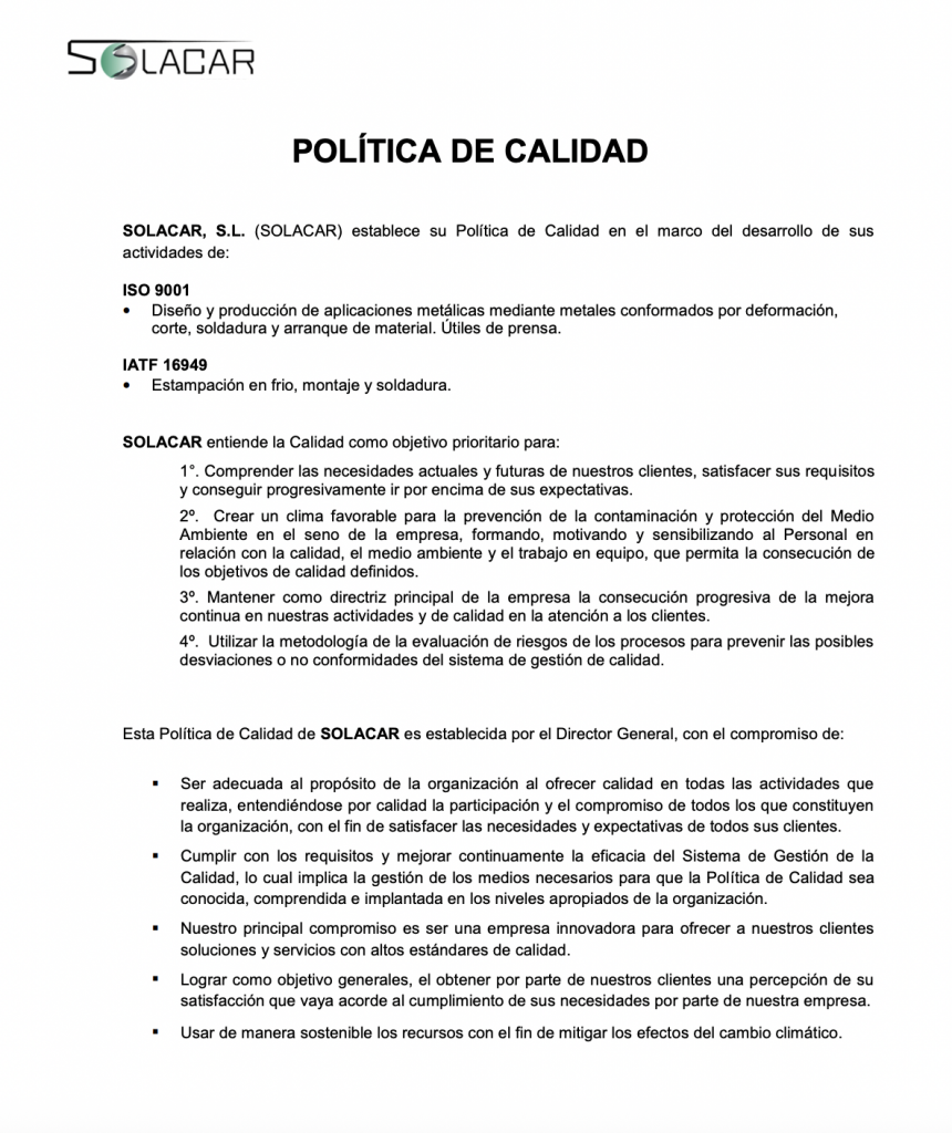 Debido a la implementación de nuestra política de calidad, garantizamos que la fabricación de nuestros productos y nuestra cadena de valor siempre cumplan con las especificaciones de nuestros clientes.